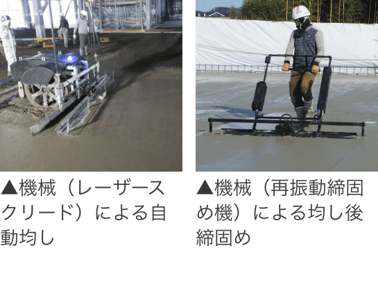 職人の技能の良し悪しに関係なく機械などを駆使してすべての工程において定量化された機械化施工を行うことでひび割れの抑制、耐久性能の向上、床の平坦性、平滑性の精度向上を図り、コンクリート床施工の課題を解決する工法になります。