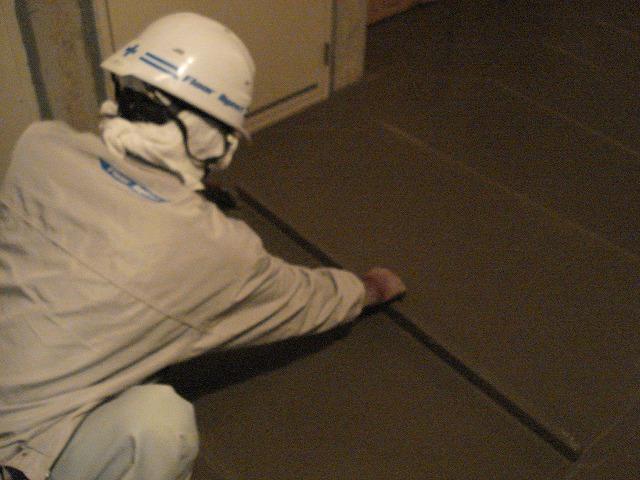 際部分が完了したら、縦方向に木鏝を馴染ませながら押えます。この時足跡などがつかないよう、確認しながら押えて適切な時間を置きます。夏季などの25℃を超える場合は硬化が著しく早くなるため、待ち時間はほとんどありません。冬季の場合は逆に乾くのが遅いため、10℃以下の場合は木鏝を入れた後、1時間以上置く場合があります。