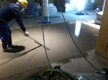 セルフレべリング材を流し、レベラーの持つ自己水平性に任せながら、トンボなどを用いて均一に均します。