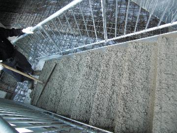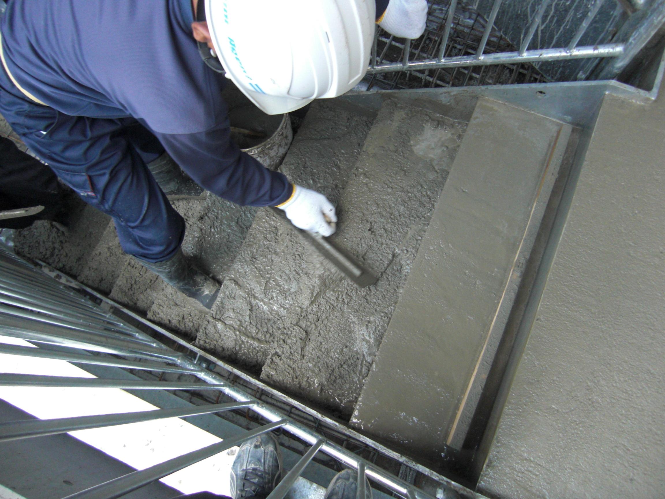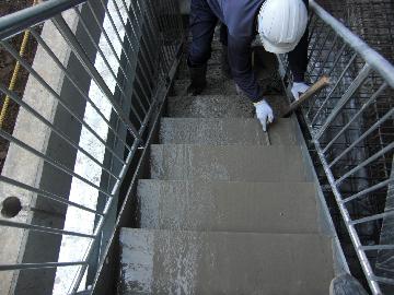 鉄骨階段に生コンまたは厚みがない場合はモルタルを流し、段鼻の位置に合わせ荒均しを行います。