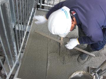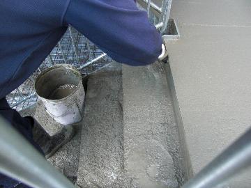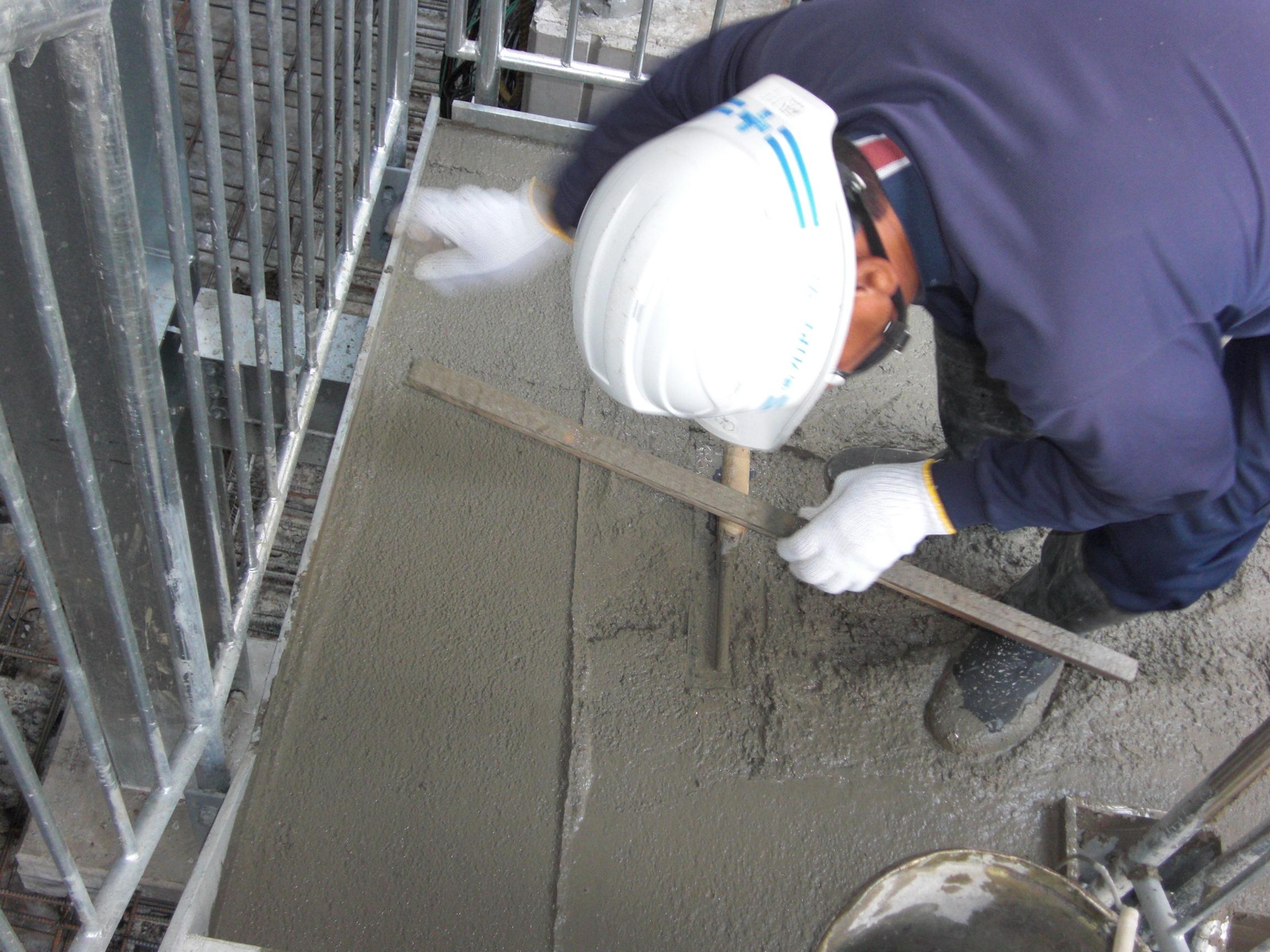 踊り場も同じように際部分に付着したセメントペーストをよく水洗いし、定規を用いて摺り合わせを行います。※水洗いした水が均し面に入った場合はスポンジ等で水をよくしみこませ取り除きます。