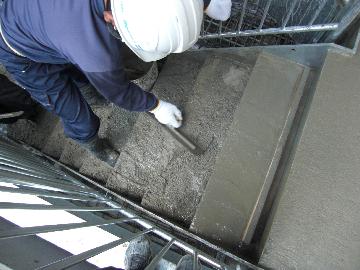 鉄骨に付着したセメントペーストを刷毛を用いて水洗いします。特に蹴込の部分などは念入りに洗います。