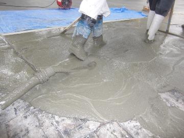 モルタルを流しこんでカッパギにて平らにあら均しを行い、レベルポイントとなるモルタルの天端に合わせます。