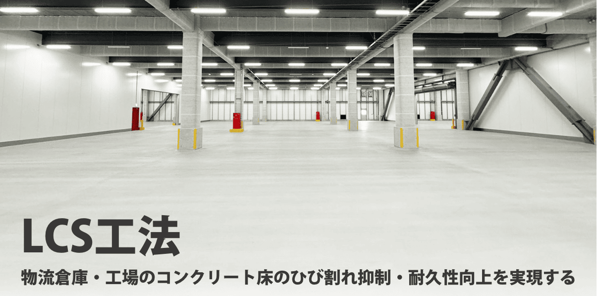 当社が開発したLCS工法とは、新設時に物流倉庫や工場のコンクリート床施工に求められる、レベル精度・ひび割れ抑制・耐久性をクリアし、従来のコンクリート床よりも品質向上が期待できる次世代のコンクリート床施工技術です。