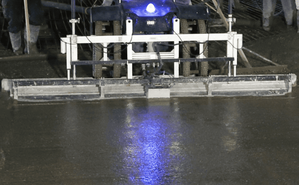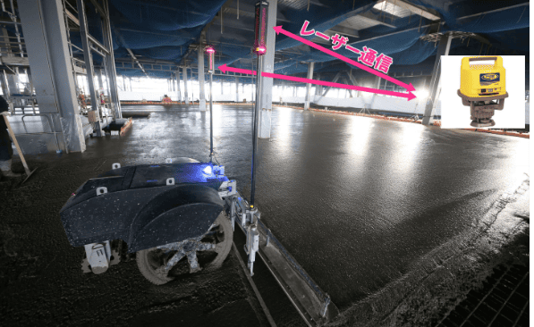 レーザースクリードブレード両端に2基のレーザー子機が定着され、自動レベル調整システムによって水平を保持しながら均しを行います。