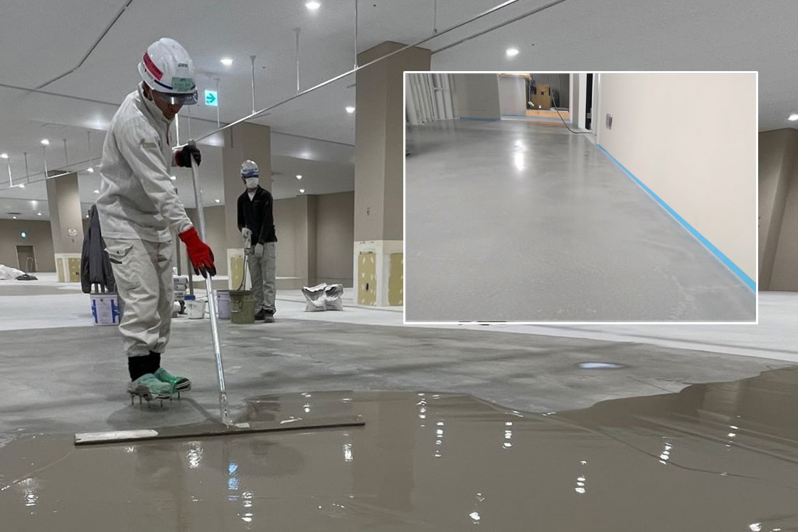 レベラーとはセルフレベリングの略で、これまでモルタルなどで行われていた下地調整材をセルフレベリングに変えることで、速乾によって養生期間および工期の短縮に貢献する材料として広く使われています。