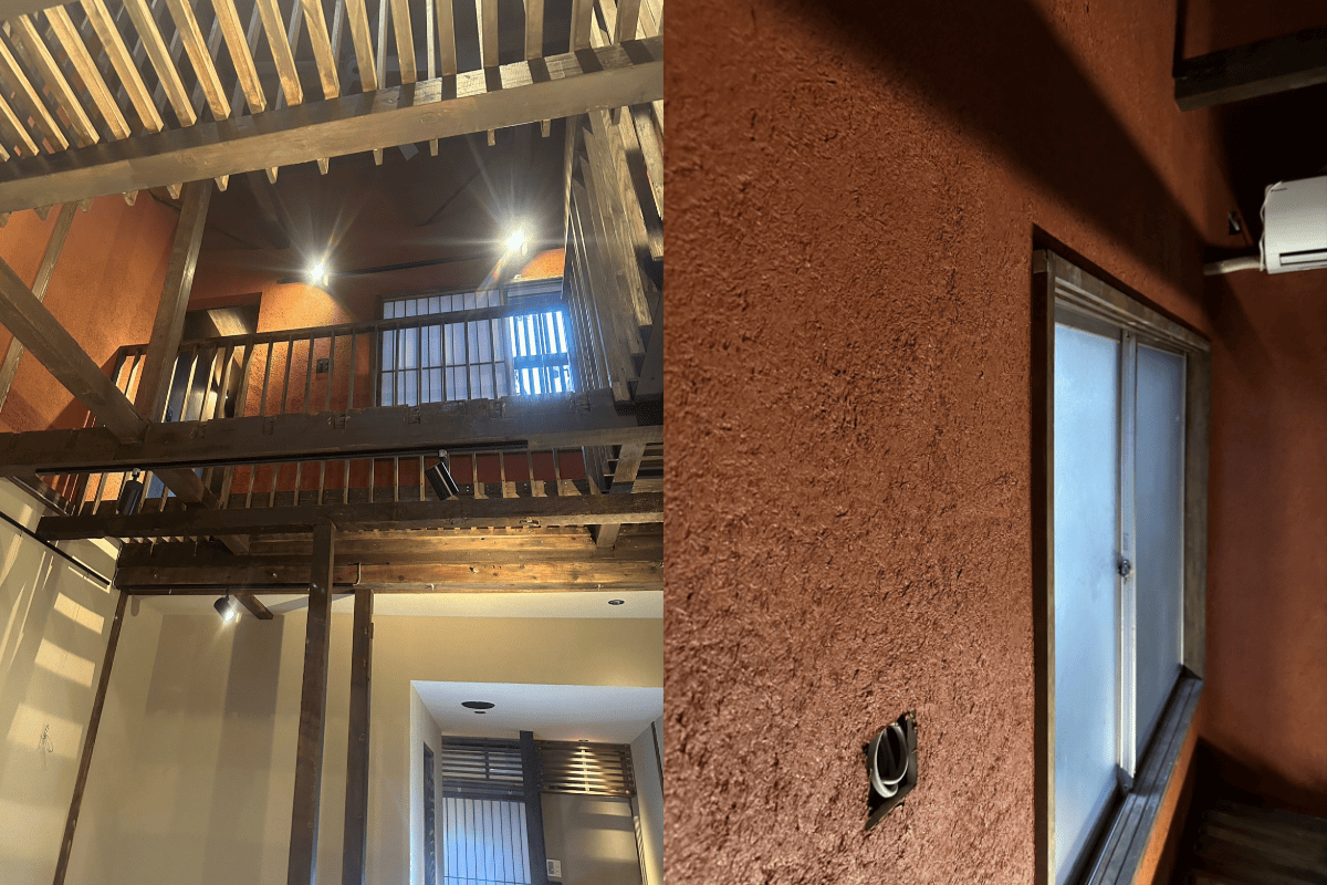 聚楽仕上げの原料は、本来【聚楽土、藁や麻、砂、水等】をこねて作られますが、現代では樹脂を主材とした京壁風の材料が普及しており、それらを水と練り上げ使用するのが一般的です。漆喰同様に調湿性・不燃性・消臭性を備え、風合いとして土の質感を生かした色合いが特徴で、日本家屋が古くから持つ和の風情や趣を表現できることから高級料亭や古民家風飲食店などの内外装に多く使用されます。
